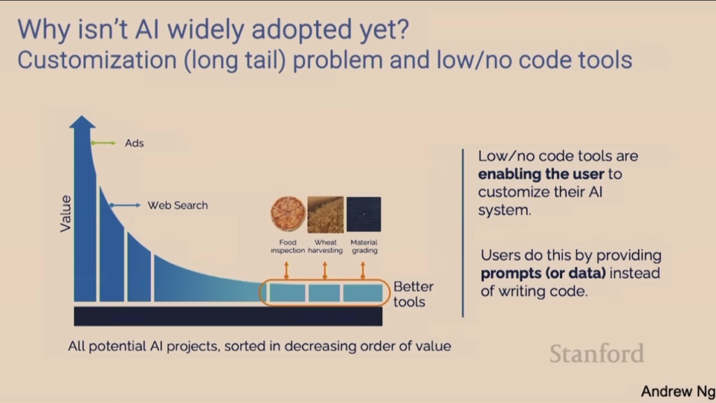 แต่การที่มีเรื่อง Low/no code มาให้เราใช้กันมากขึ้น รวมไปถึงการพัฒนาโมเดลได้ด้วยการ Prompts ทำให้เปิดโอกาสที่จะแก้ปัญหาที่เป็นโจทย์ที่มีความหลากหลายมากยิ่งขึ้น